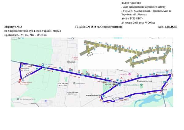 Маршрут №13 ТСЦ №6844. Для перевірки навичок керування ТЗ категорій B, BE, D1, D.