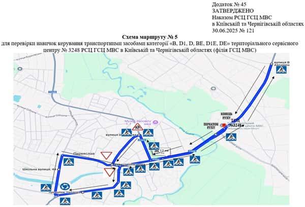 Маршрут №5 ТСЦ МВС № 3248. Для перевірки навичок керування ТЗ категорії B, D, D1, BE, D1E, DE.