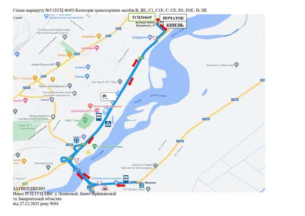 Маршрут №5 ТСЦ МВС № 4645. Для перевірки навичок керування ТЗ категорії B, BE, C1, C1E, C, CE, D1, D1E, D, DE.