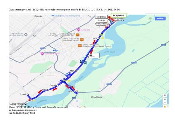 Маршрут №12 ТСЦ МВС № 4645. Для перевірки навичок керування ТЗ категорії B, BE, D1, D, D1E, DE.