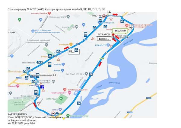 Маршрут №3 ТСЦ МВС № 4645. Для перевірки навичок керування ТЗ категорії B, BE, D1, D, D1E, DE.