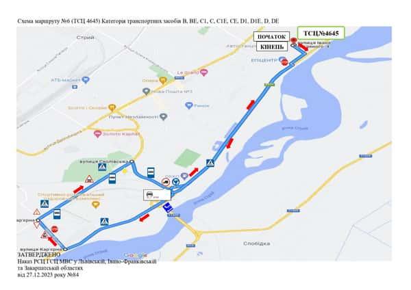 Маршрут №6 ТСЦ МВС № 4645. Для перевірки навичок керування ТЗ категорії B, BE, C1, C1E, C, CE, D1, D1E, D, DE.