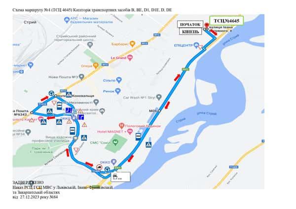 Маршрут №4 ТСЦ МВС № 4645. Для перевірки навичок керування ТЗ категорії B, BE, D1, D, D1E, DE.