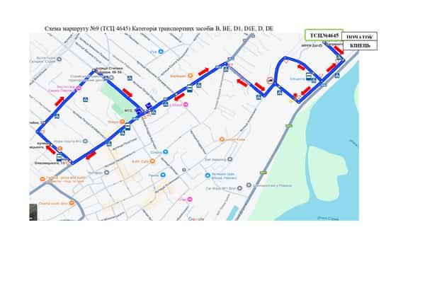 Маршрут №9 ТСЦ МВС № 4645. Для перевірки навичок керування ТЗ категорії B, BE, D1, D, D1E, DE.
