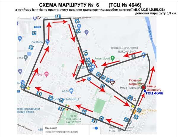 Маршрут №6 ТСЦ МВС № 4646. Для перевірки навичок керування ТЗ категорії B, C1, C, D1, D, BE, CE.