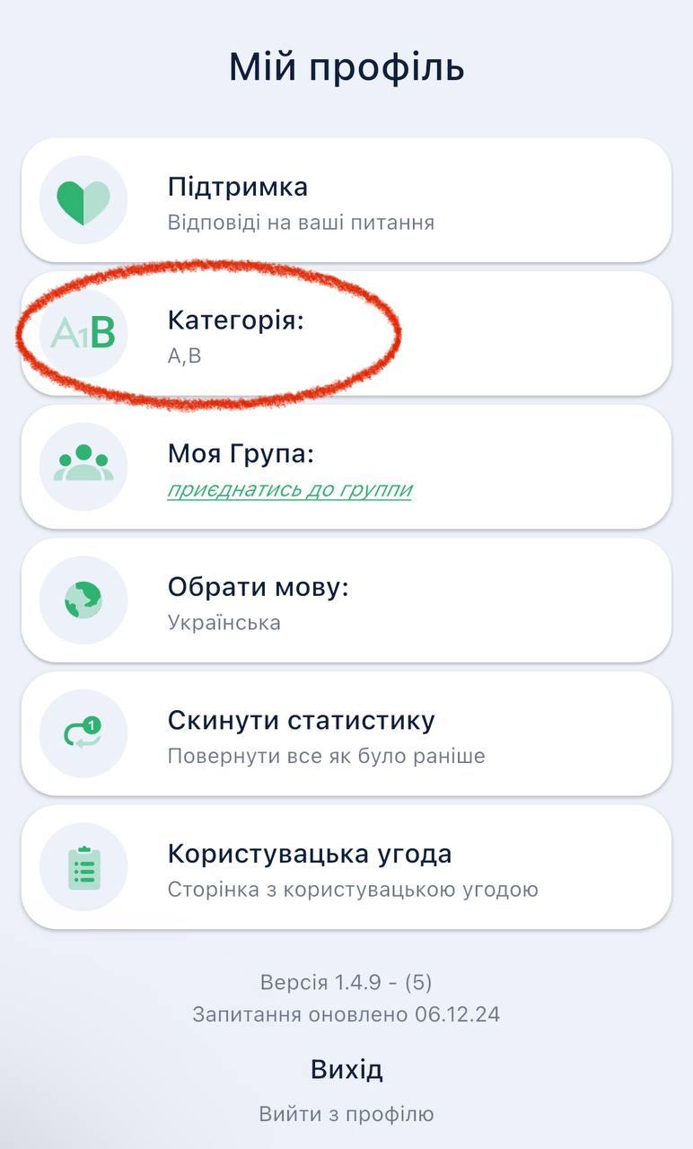 В Профілі оберть потрібну Вам категорію і тоді в тестах Вам траплятимуться питання, які чекають Вас на іспиті. .