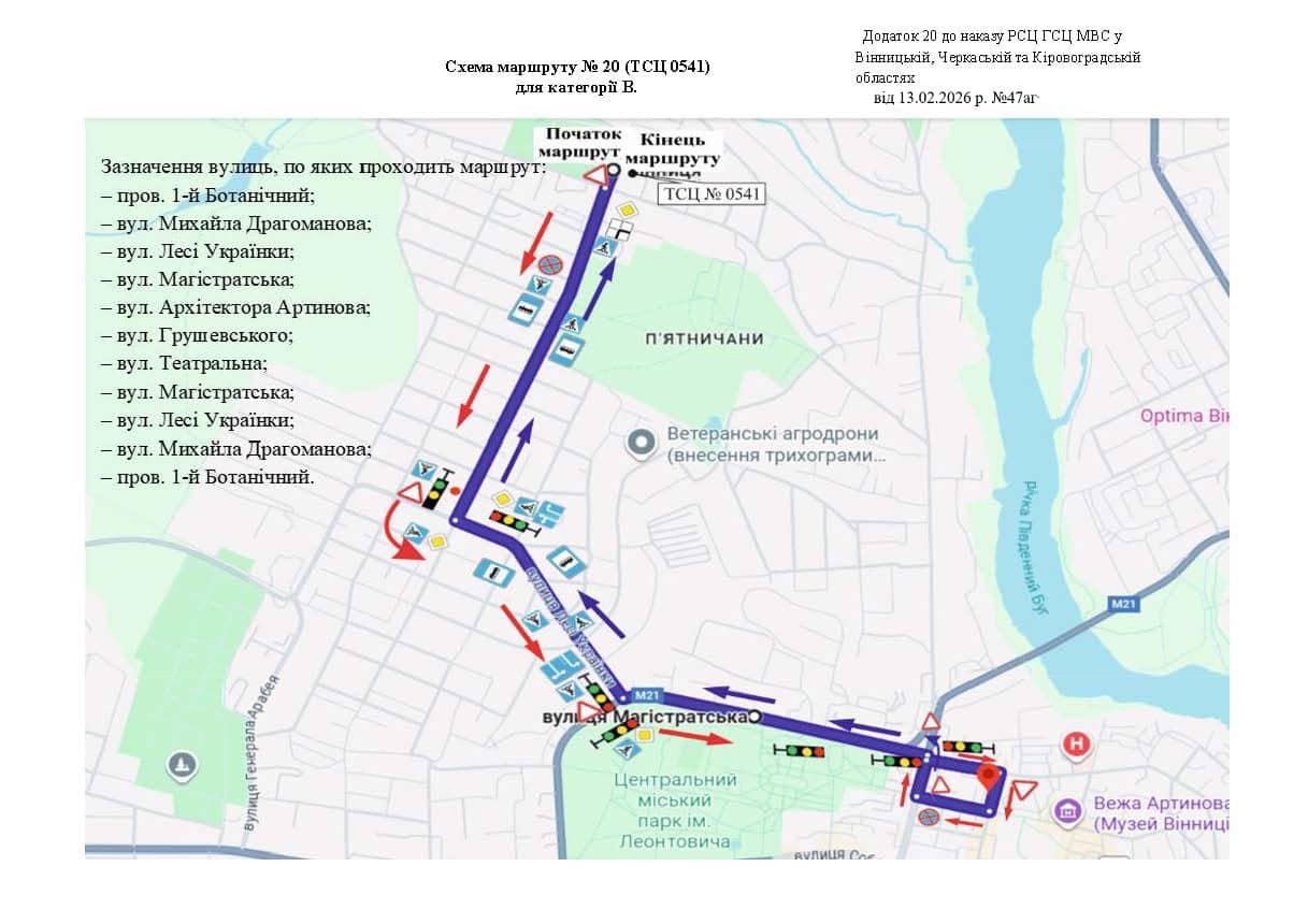 Маршрут №20 ТСЦ МВС № 0541. Для перевірки навичок керування ТЗ категорії B.