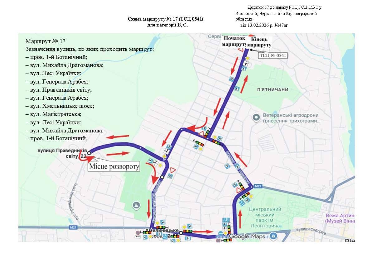 Маршрут №17 ТСЦ МВС № 0541. Для перевірки навичок керування ТЗ категорії B, C.