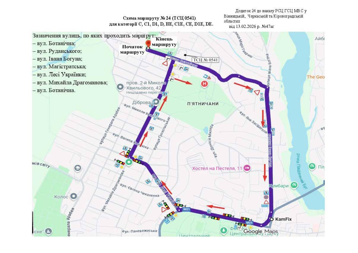 Маршрут №24 ТСЦ МВС № 0541. Для перевірки навичок керування ТЗ категорії C, C1, D1, D, BE, C1E, CE, D1E, DE.