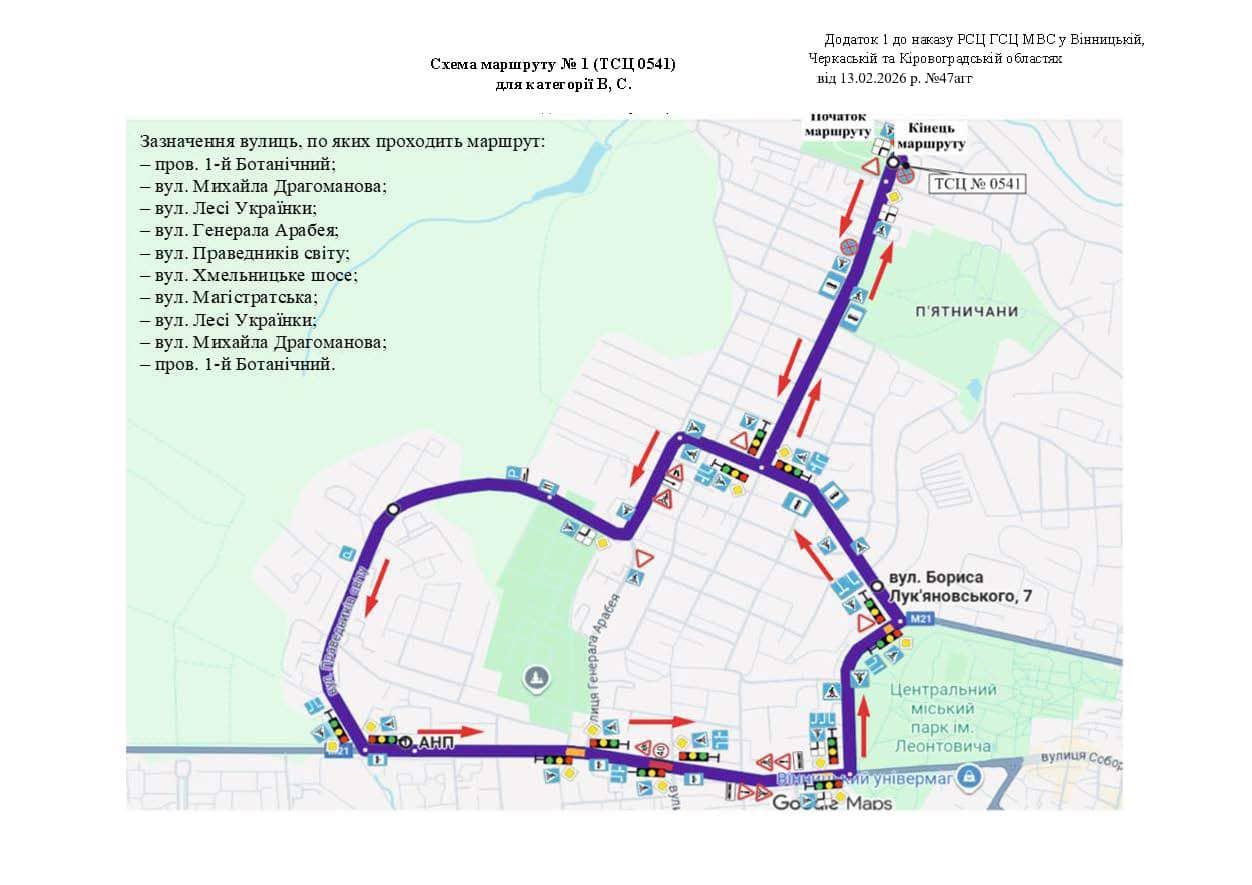 Маршрут №1 ТСЦ МВС № 0541. Для перевірки навичок керування ТЗ категорії B, C.