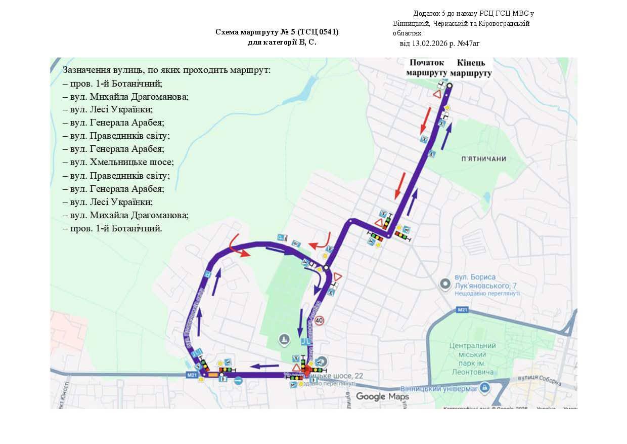 Маршрут №5 ТСЦ МВС № 0541. Для перевірки навичок керування ТЗ категорії B, C.