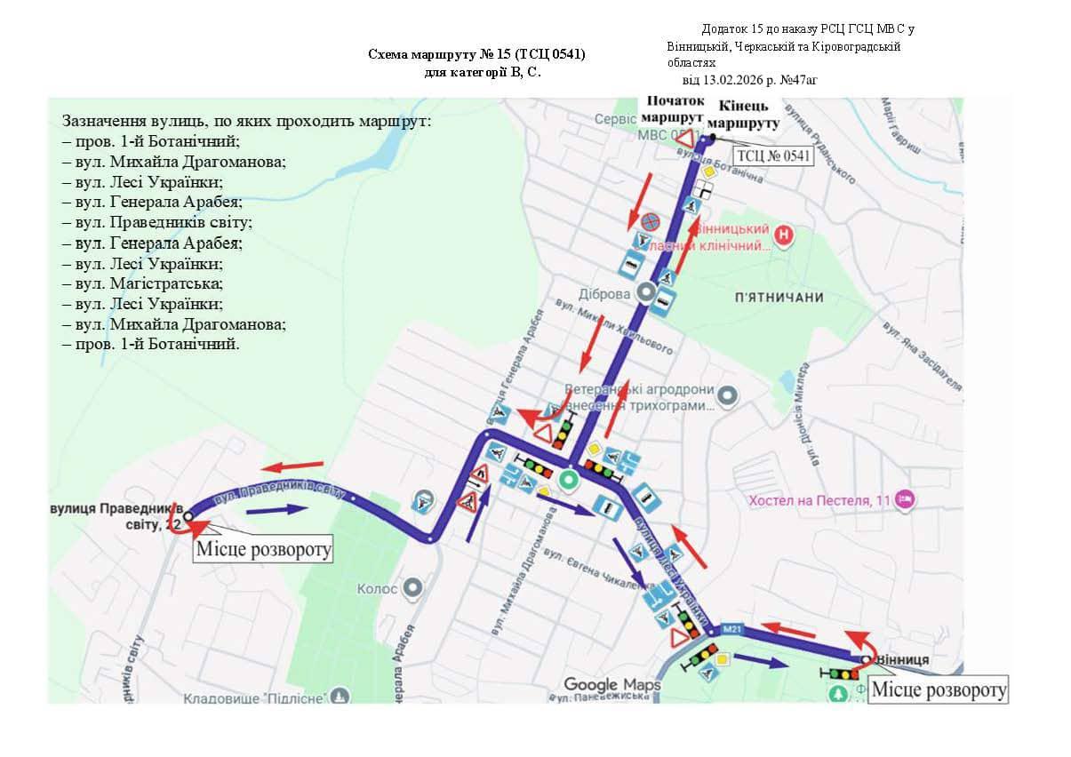 Маршрут №15 ТСЦ МВС № 0541. Для перевірки навичок керування ТЗ категорії B, C.