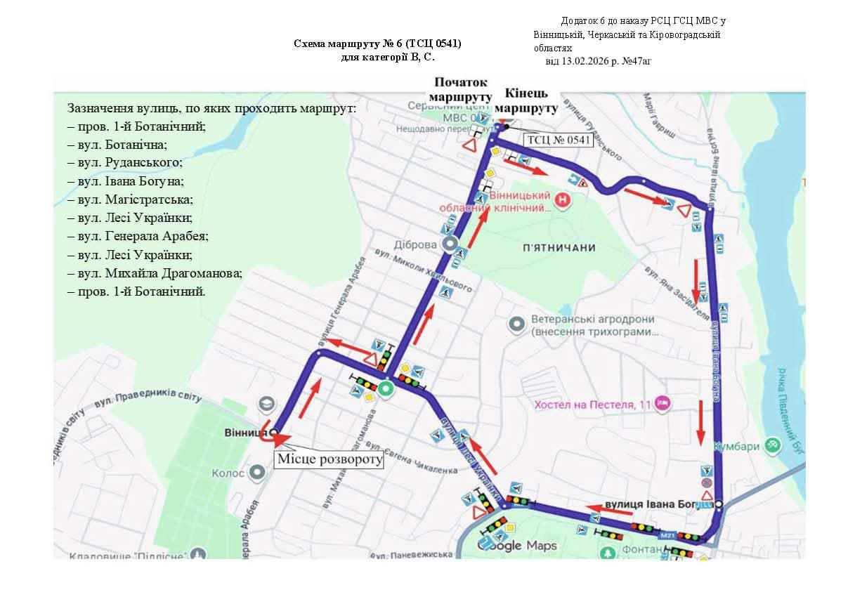 Маршрут №6 ТСЦ МВС № 0541. Для перевірки навичок керування ТЗ категорії B, C.