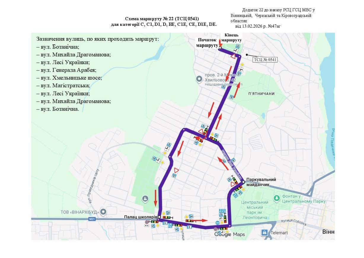 Маршрут №22 ТСЦ МВС № 0541. Для перевірки навичок керування ТЗ категорії C, C1, D1, D, BE, C1E, CE, D1E, DE.