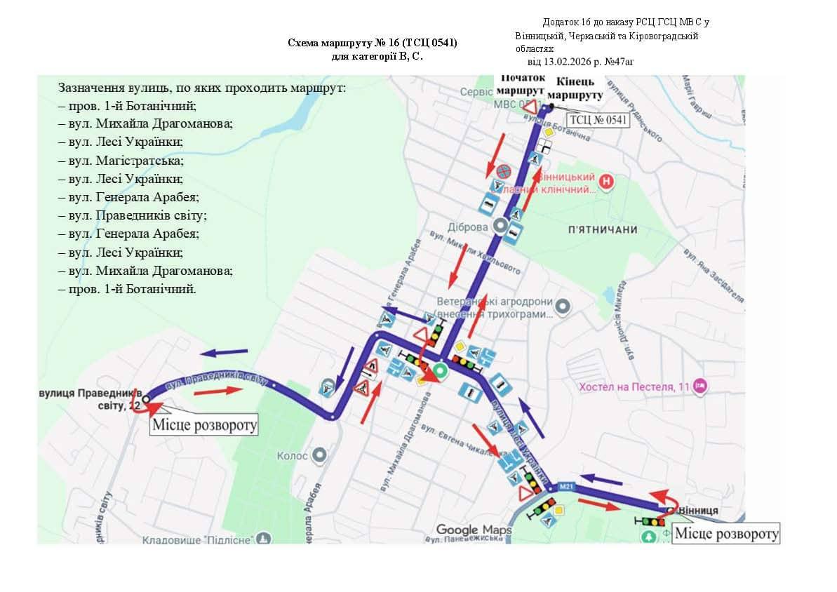 Маршрут №16 ТСЦ МВС № 0541. Для перевірки навичок керування ТЗ категорії B, C.