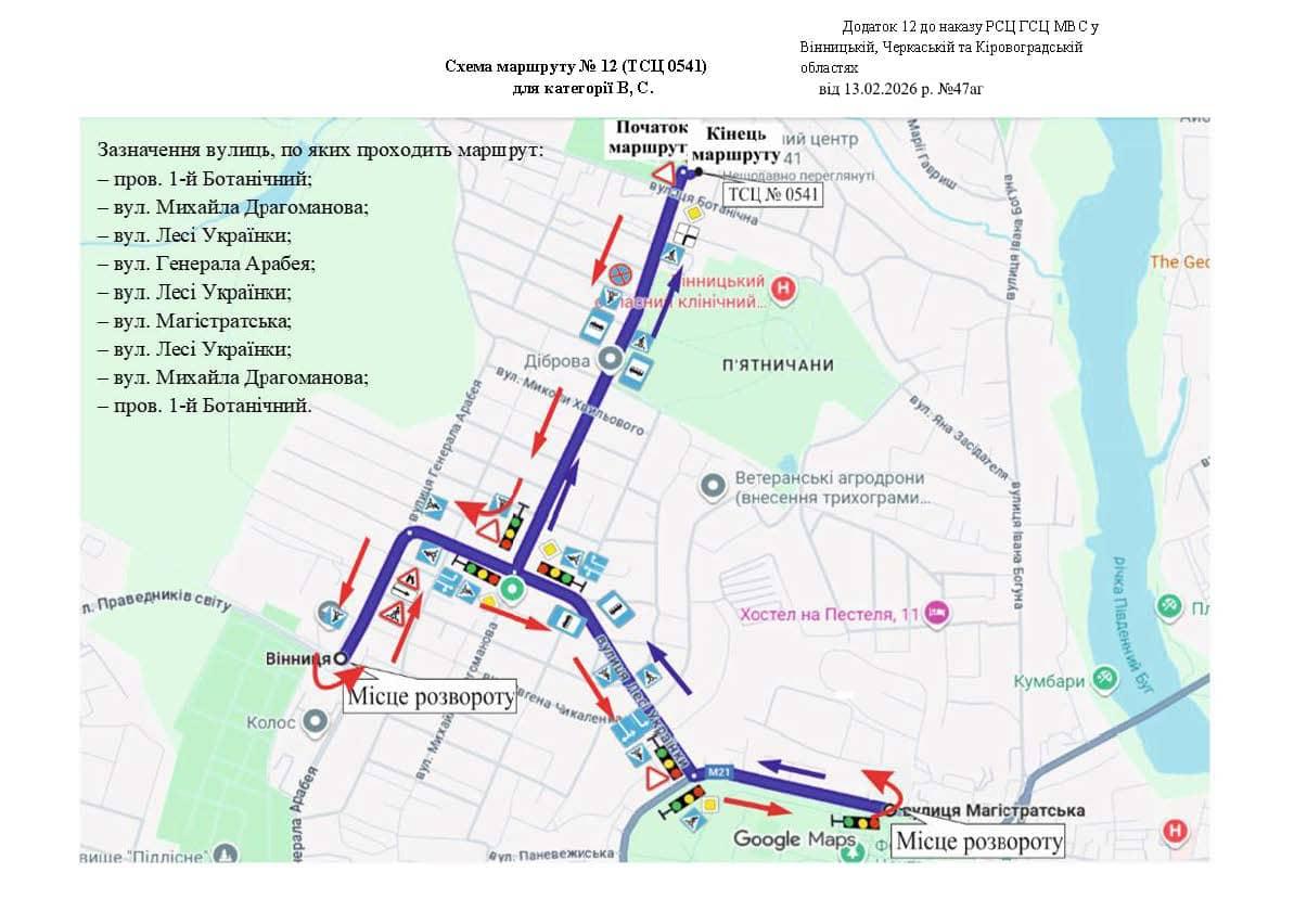 Маршрут №12 ТСЦ МВС № 0541. Для перевірки навичок керування ТЗ категорії B, C.