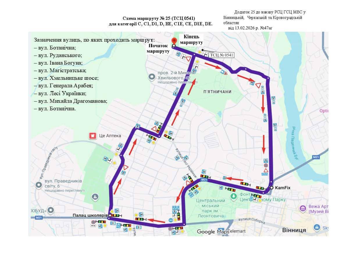 Маршрут №25 ТСЦ МВС № 0541. Для перевірки навичок керування ТЗ категорії C, C1, D1, D, BE, C1E, CE, D1E, DE.