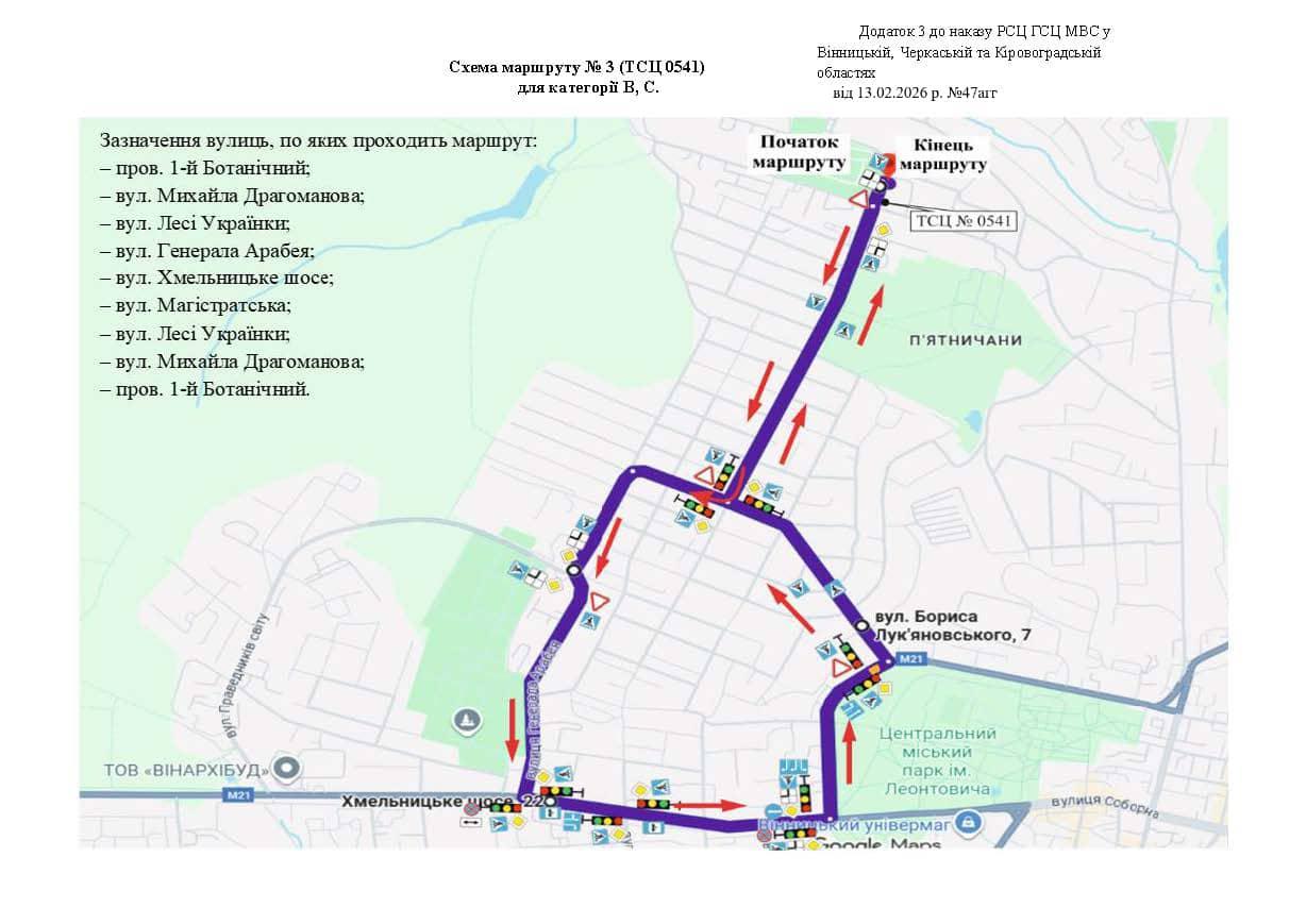 Маршрут №3 ТСЦ МВС № 0541. Для перевірки навичок керування ТЗ категорії B, C.