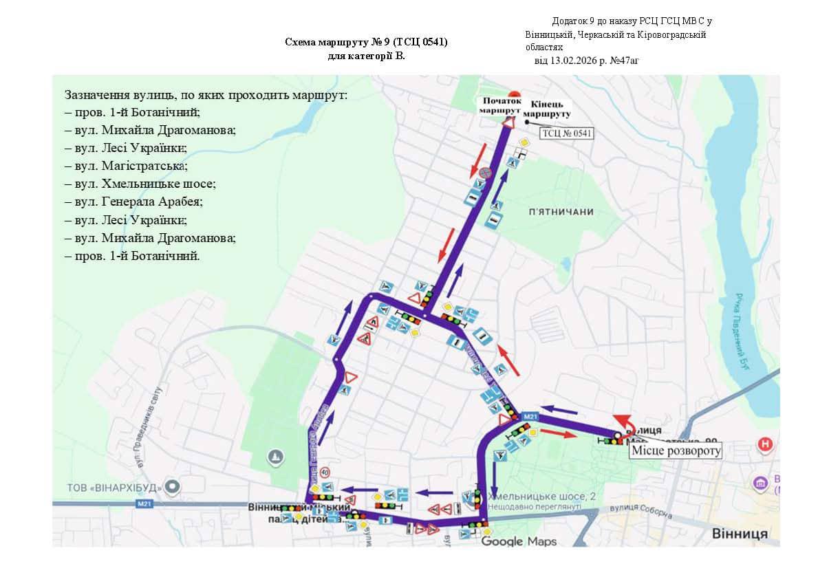 Маршрут №9 ТСЦ МВС № 0541. Для перевірки навичок керування ТЗ категорії B.