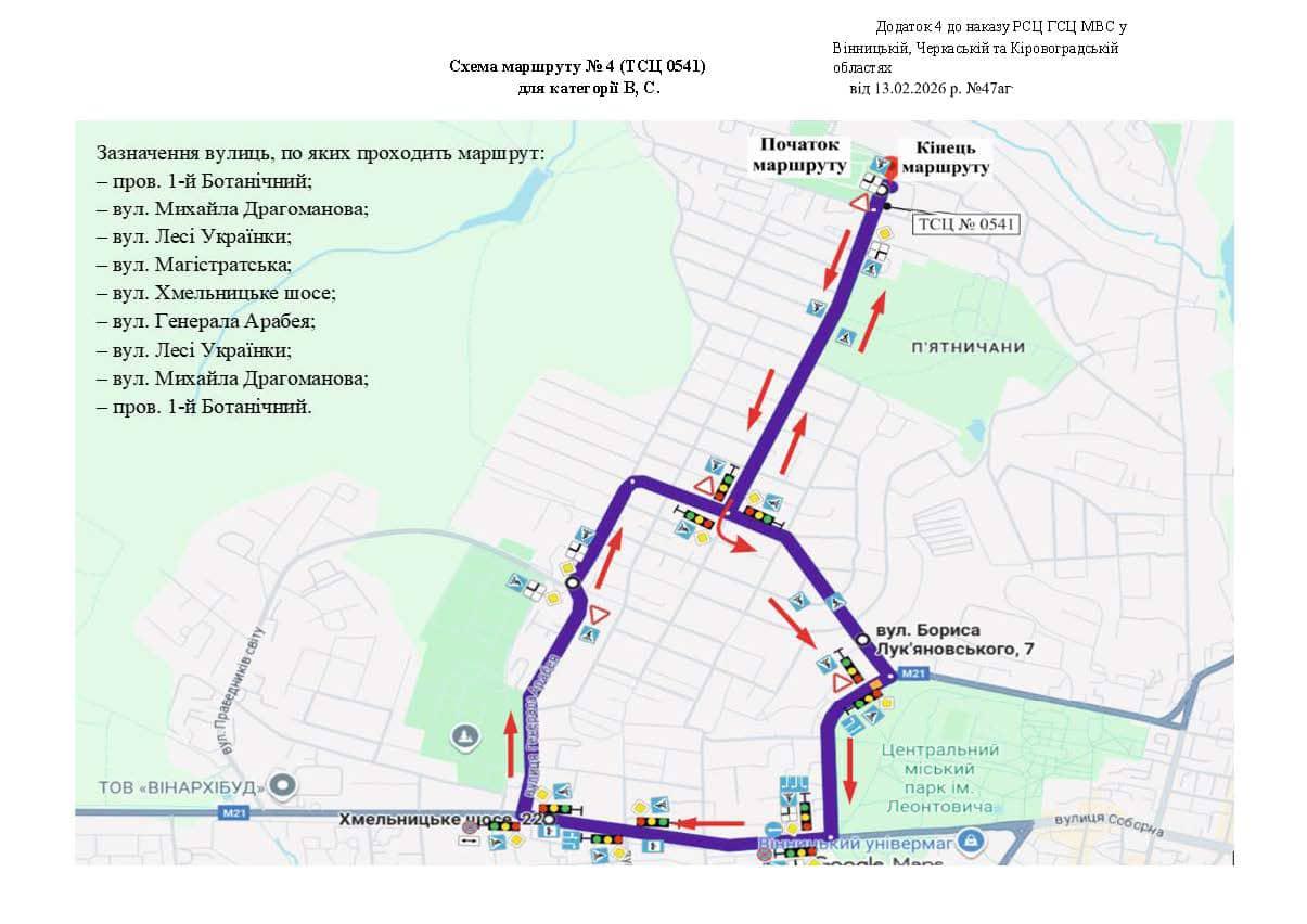 Маршрут №4 ТСЦ МВС № 0541. Для перевірки навичок керування ТЗ категорії B, C.