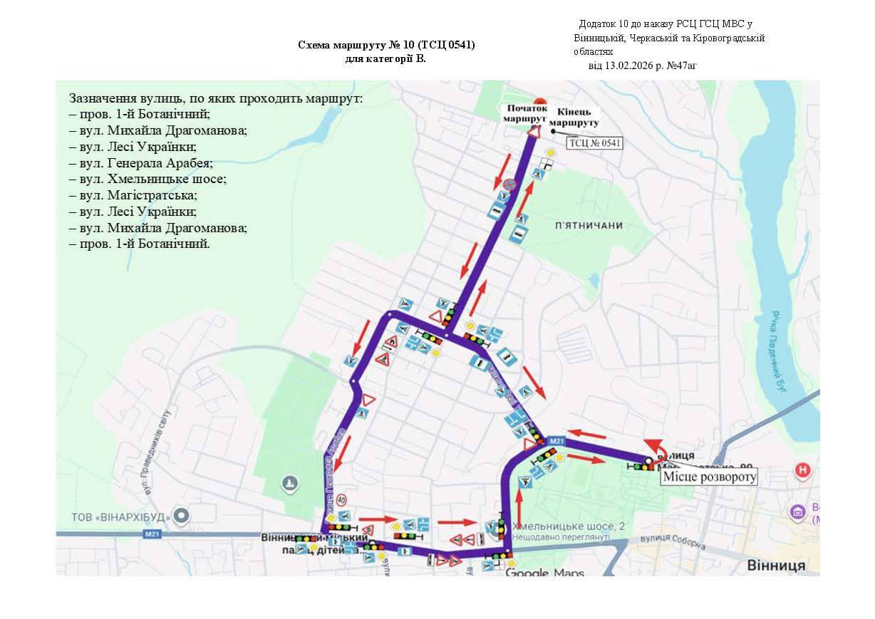 Маршрут №10 ТСЦ МВС № 0541. Для перевірки навичок керування ТЗ категорії B.