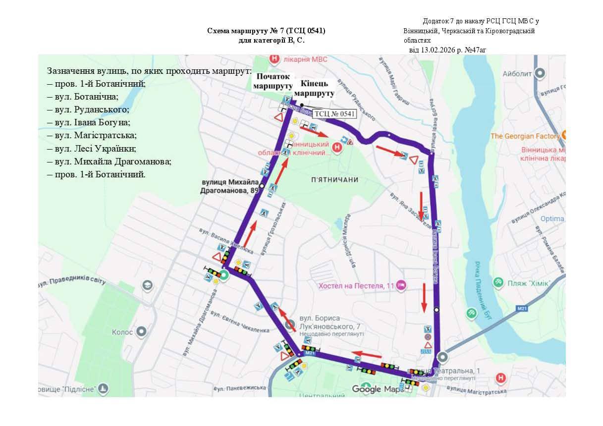 Маршрут №7 ТСЦ МВС № 0541. Для перевірки навичок керування ТЗ категоріїї B, C.