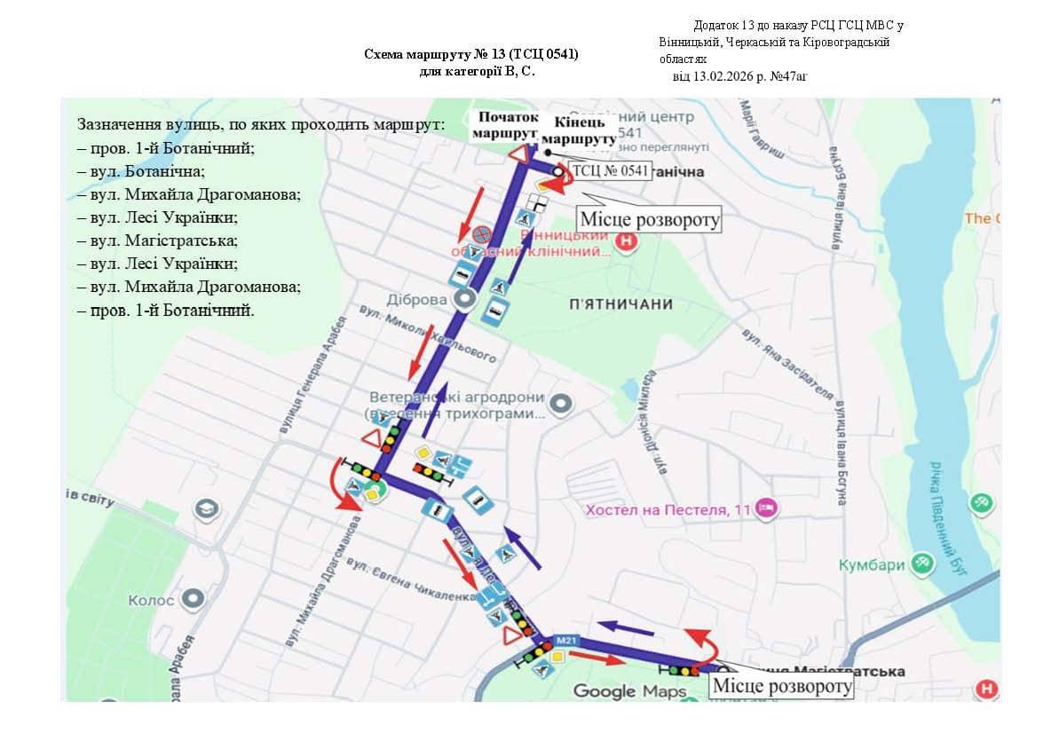 Маршрут №13 ТСЦ МВС № 0541. Для перевірки навичок керування ТЗ категорії B, C.
