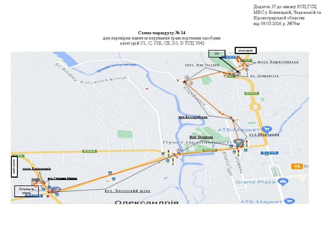 Маршрут №14 ТСЦ МВС № 3542. Для перевірки навичок керування ТЗ категорії C1, C, C1E, CE, D1, D.