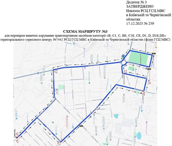 Маршрут №3 ТСЦ МВС № 7442. Для перевірки навичок керування ТЗ категорії B, С1, С, ВЕ, С1Е, СЕ, D1, D, D1E, DE.