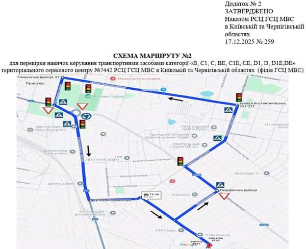 Маршрут №2 ТСЦ МВС № 7442. Для перевірки навичок керування ТЗ категорії B, С1, С, ВЕ, С1Е, СЕ, D1, D, D1E, DE.
