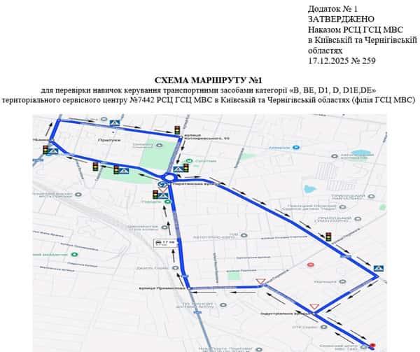 Маршрут №1 ТСЦ МВС № 7442. Для перевірки навичок керування ТЗ категорії B, С1, С, ВЕ, С1Е, СЕ, D1, D, D1E, DE.
