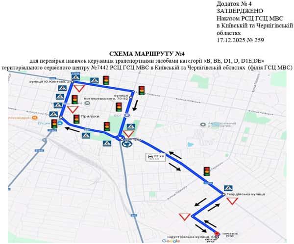 Маршрут №4 ТСЦ МВС № 7442. Для перевірки навичок керування ТЗ категорії B, ВЕ, D1, D, D1E, DE.