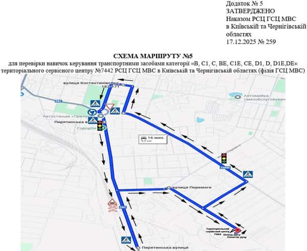Маршрут №5 ТСЦ МВС № 7442. Для перевірки навичок керування ТЗ категорії B, С1, С, ВЕ, С1Е, СЕ, D1, D, D1E, DE.