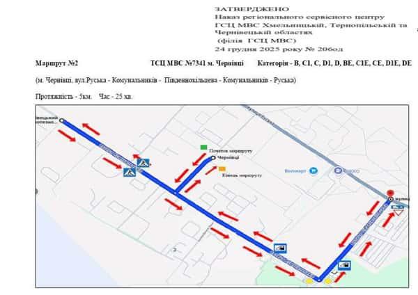 Маршрут №2 ТСЦ МВС № 7341. Для перевірки навичок керування ТЗ категорії B, C1, C, D1, D, BE, C1E, CE, D1E, DE.