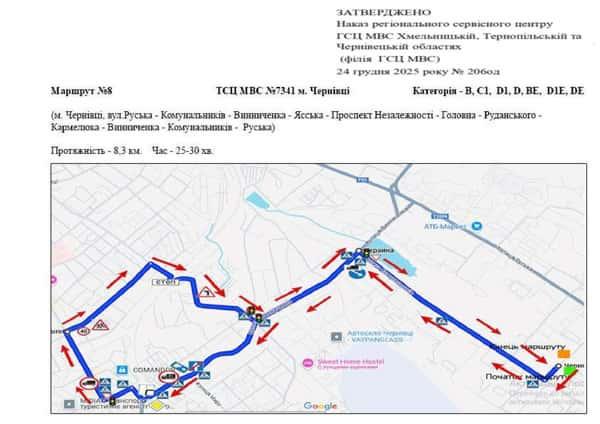 Маршрут №8 ТСЦ МВС № 7341. Для перевірки навичок керування ТЗ категорії B, C1, D1, D, BE, D1E, DE.
