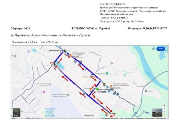 Маршрут №20 ТСЦ МВС № 7341. Для перевірки навичок керування ТЗ категорії B, D1, D, BE, D1E, DE.