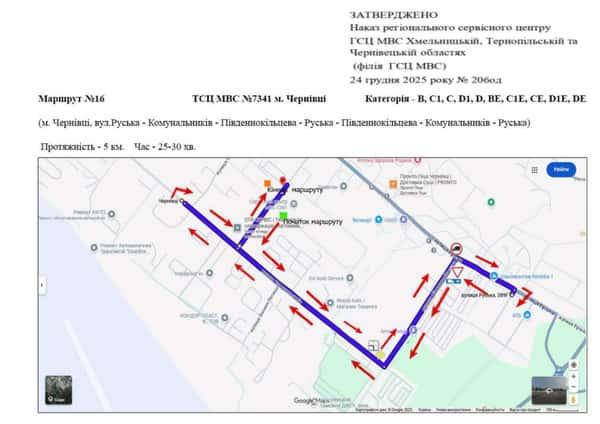 Маршрут №16 ТСЦ МВС № 7341. Для перевірки навичок керування ТЗ категорії B, C1, C, D1, D, BE, C1E, CE, D1E, DE.