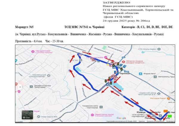 Маршрут №5 ТСЦ МВС № 7341. Для перевірки навичок керування ТЗ категорії B, C1, D1, D, BE, D1E, DE.