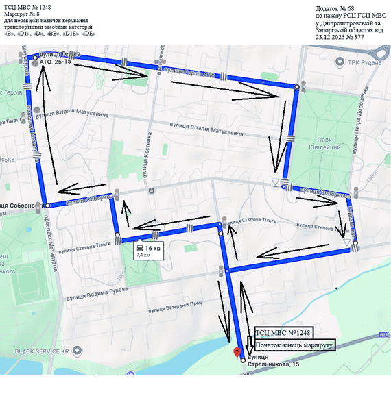 Маршрут №8 ТСЦ МВС № 1248. Для перевірки навичок керування ТЗ категорії B, BE, D1E, D1, D, DE.