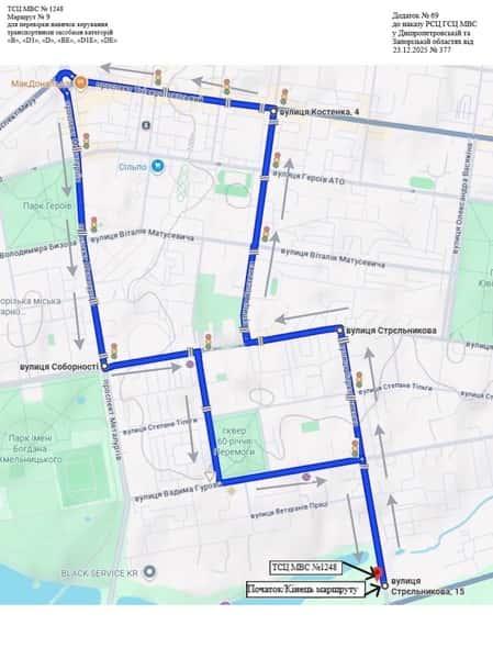 Маршрут №9 ТСЦ МВС № 1248. Для перевірки навичок керування ТЗ категорії B, BE, D1E, D1, D, DE.