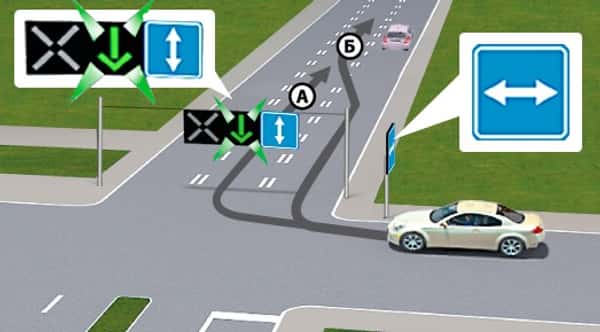 По якій траєкторії водій білого автомобіля може виїжджати на смугу з реверсивним рухом при повороті?