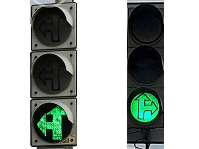 Зверніть увагу, що на даних світлофорах контурна стрілка повинна бути тільки на основному зеленому, а червоний і жовтий сигнали використовуються як на звичайному трьох секційному світлофорі. Є ще одна обов'язкова вимога до встановлення світлофорів такого типу - це білий щит навколо світлофора.