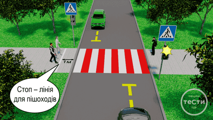 4)при сигналах, що забороняють рух – зупинитися в 1 м від бордюру (це умовна «стоп-лінія!» для пішохода. Дивись на малюнку нижче);