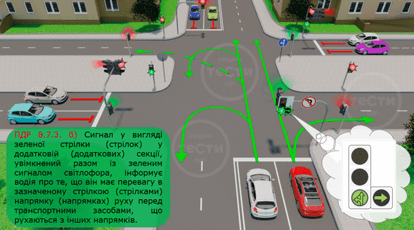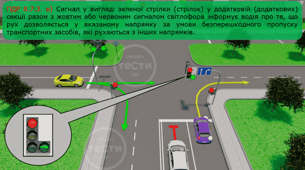 ПДР 8.7.3. Стрілка зеленого кольору на табличці, встановленій на рівні червоного сигналу світлофора з вертикальним розташуванням сигналів, дозволяє рух у зазначеному напрямку при ввімкненому червоному сигналі світлофора з крайньої правої смуги руху (або крайньої лівої смуги руху на дорогах з одностороннім рухом) за умови надання переваги в русі іншим його учасникам, які рухаються з інших напрямків на сигнал світлофора, що дозволяє рух.