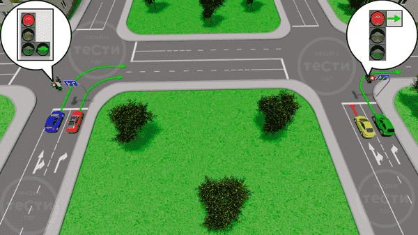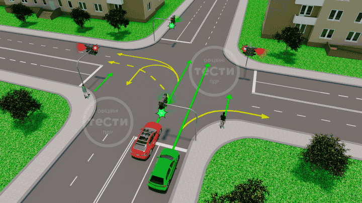 1)для зеленого та червоного авто горить зелений сигнал, в той час для автомобілів праворуч та ліворуч буде горіти червоний сигнал.